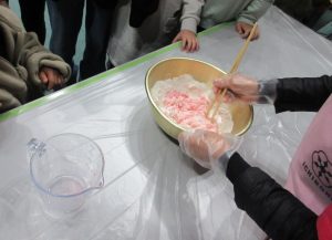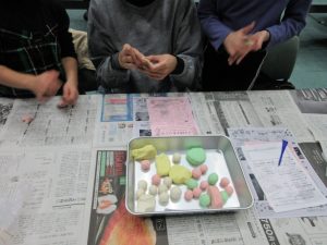 食改さんの指導のもと、皆さんで色とりどりの団子をこねました🍡