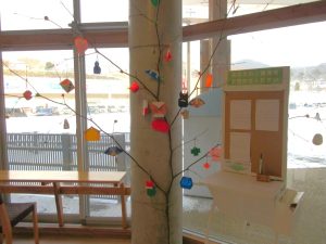 お飾りを作って、団子も茹で上がったら、早速木に飾りつけます。