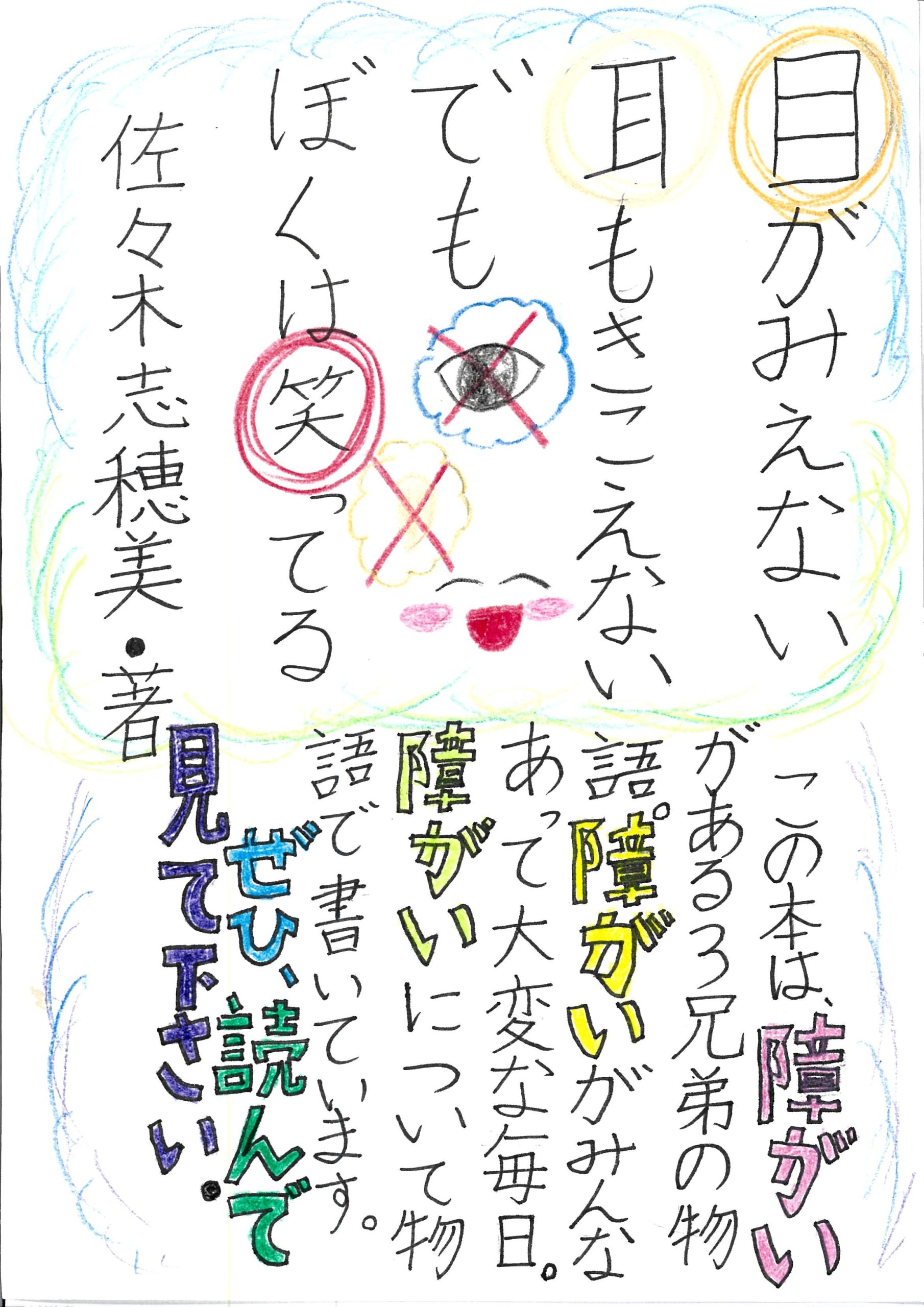 小学生の部 最優秀賞 奥中山小学校6年『目がみえない耳もきこえないでもぼくは笑ってる 障がい児3兄弟物語』佐々木 志穂美/著、KADOKAWA