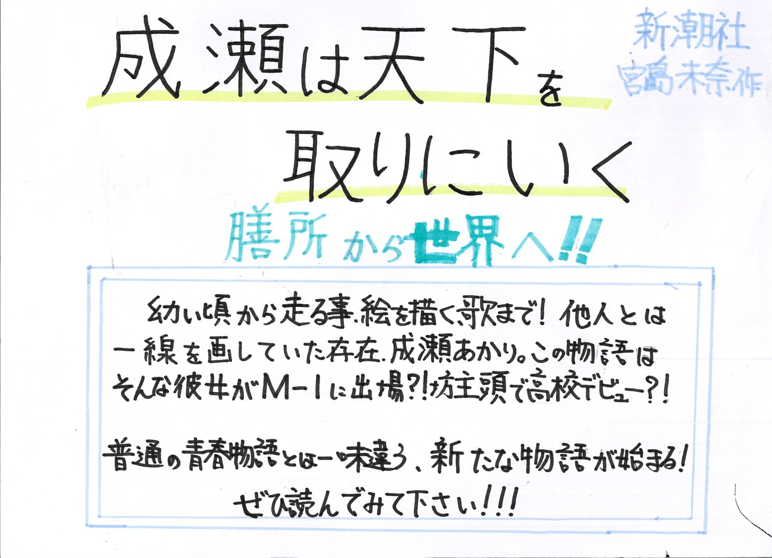中学生の部 優秀賞 奥中山中学校1年『成瀬は天下を取りにいく』 宮島 未奈/著、 新潮社