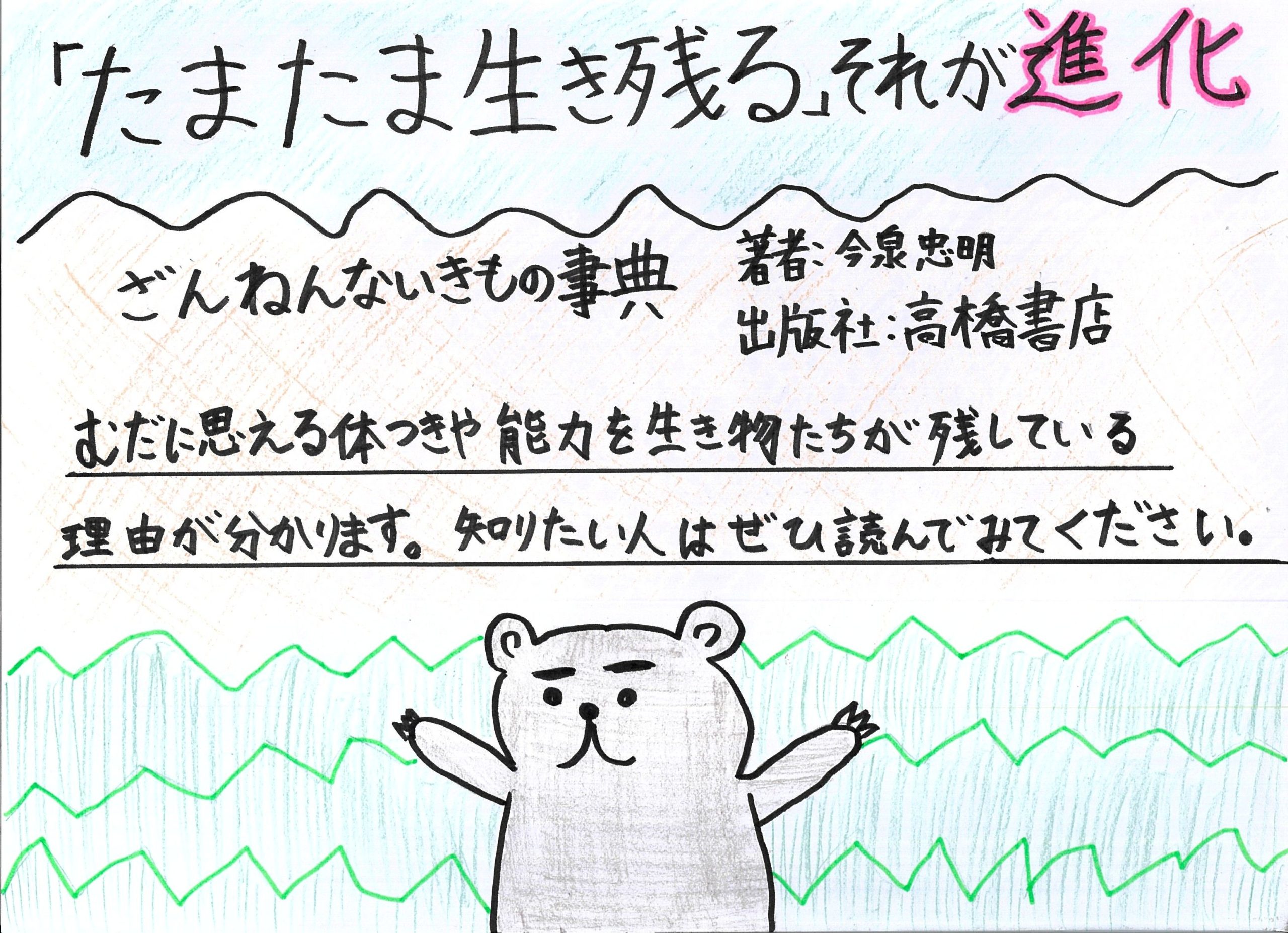 中学生の部 佳作 奥中山中学校1年『ざんねんないきもの事典 続 おもしろい!進化のふしぎ』 今泉 忠明/著、高橋書店