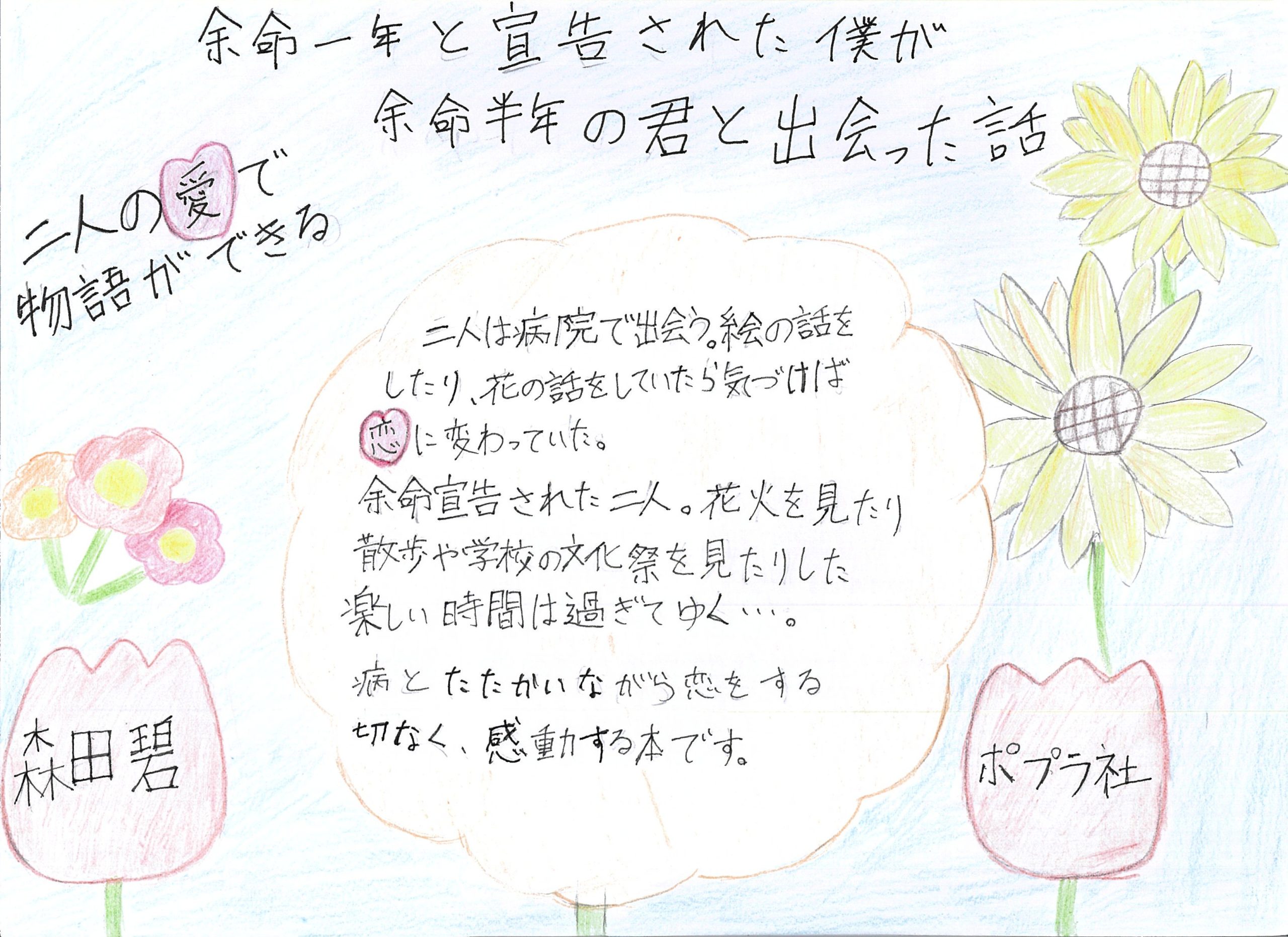 中学生の部 佳作 奥中山中学校1年『余命一年と宣告された僕が、余命半年の君と出会った話 』 森田 碧/著、ポプラ社