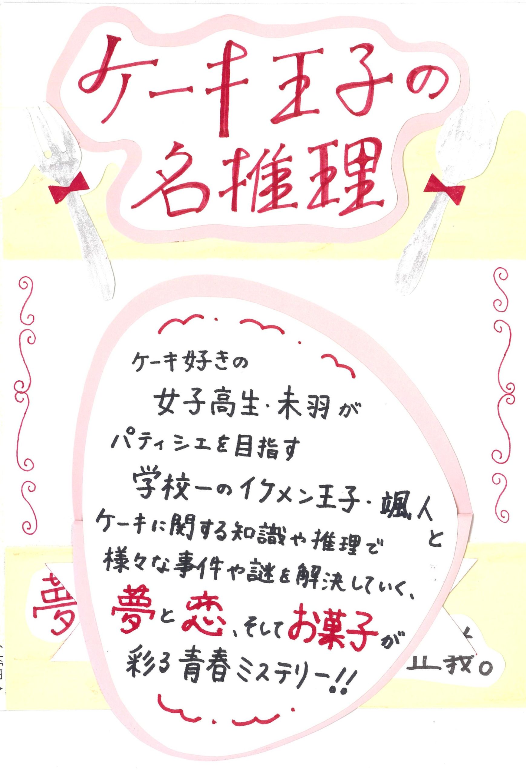 一般の部(高校生以上) 優秀賞 岩手県立北桜高等学校 『ケーキ王子の名推理』七月 隆文/著、新潮社 (※しかけあり 2枚中2枚目)