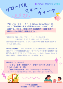 図書館入り口付近にて、特別展示「グローバル・マネー・ウィーク関連展示 〜こども・若者・新社会人へ お金について深く知ろう!~」を展示しています。